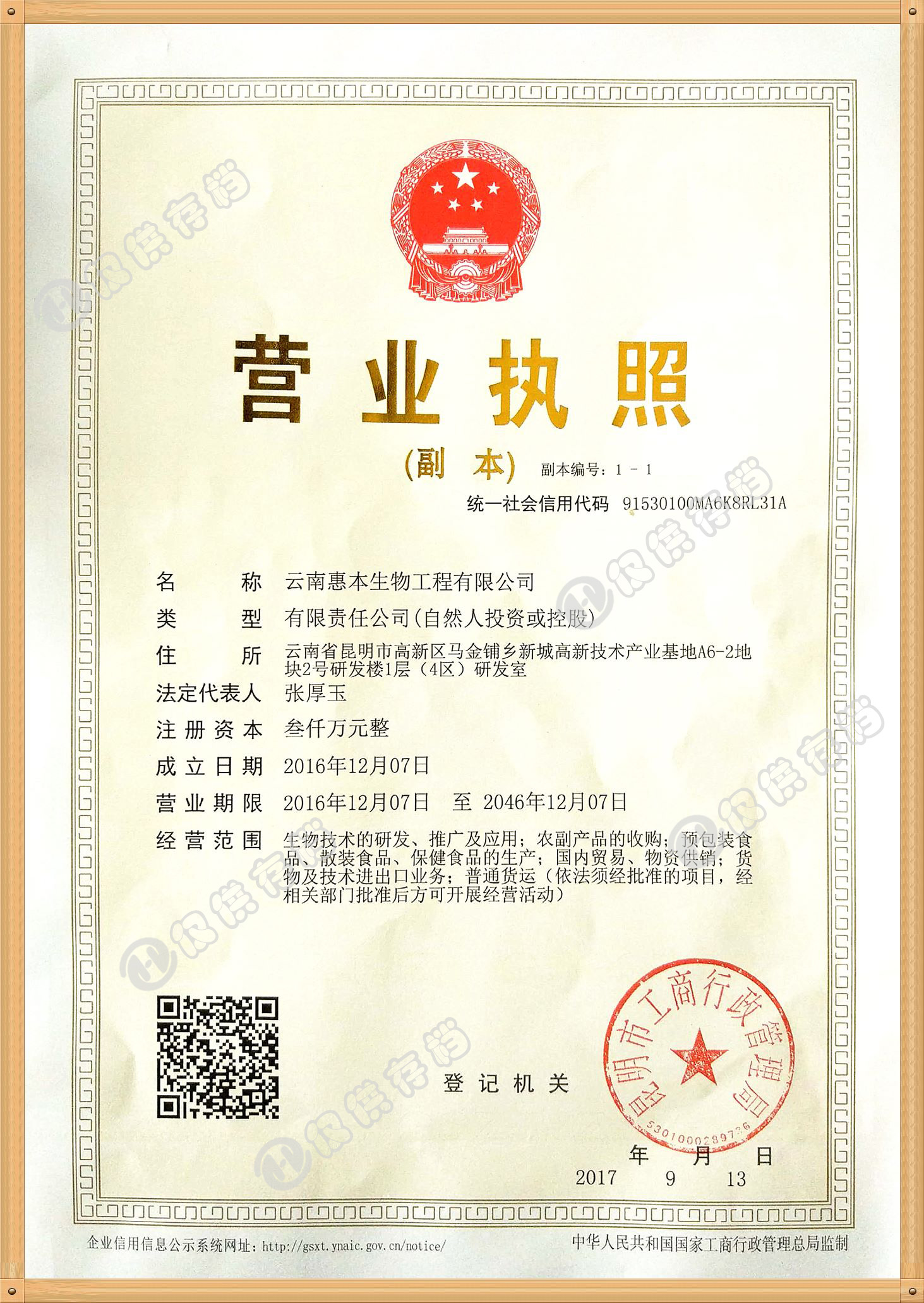 2016年12月7日, 云南惠本生物工程有限公司正式成立啦!云南惠本生物工程有限公司地处昆明高新区马金铺新区国家生物产业基地,...