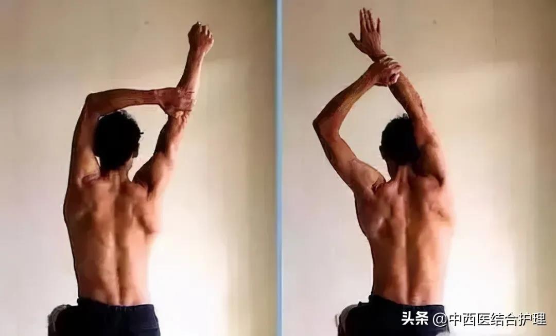 向后伸出左手臂, 弯曲手肘手背贴背的右侧